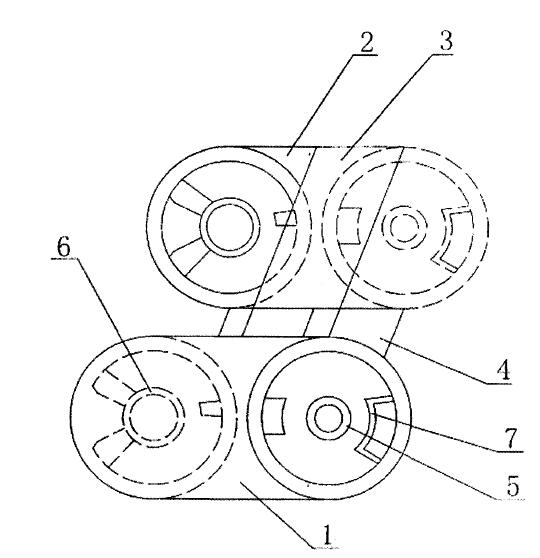 [0010]如圖所示,本實(shí)用新型由若干工程塑料制成的鏈節(jié)相互鉸連接組成,相鄰的鏈節(jié)之間設(shè)置封閉板80Fool 1 ]各鏈節(jié)主要由兩片相對(duì)設(shè)置、呈倒腰鼓形的板體1,2組成,兩片板體之間上、下面分別設(shè)置上、下接緊片3,4。