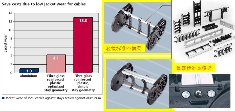 注:可選鋁橫梁和不同幾何結(jié)構(gòu)的橫梁;為何德國一直以來專著于橫梁設(shè)計(jì)的研究,因?yàn)橥ㄟ^試驗(yàn)測試普通塑料橫梁對電纜造成的損耗為優(yōu)化塑料橫梁的3倍,是鋁制橫梁的13倍;目前除了,很少有其他廠家對此進(jìn)行深入研究