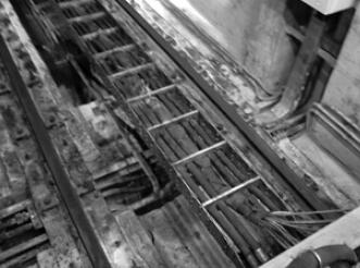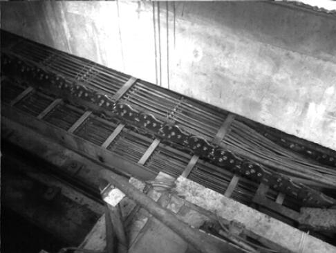 通過觀察,鋼卷運輸車的拖鏈在運行過程中中間有下垂的現(xiàn)象,這主要是由于鋼卷運輸車的行程較長。入口鋼卷運輸車的行程為13000mm,出口鋼卷運輸車的行程為14000mm,而在這么長的行程范圍內(nèi)在設(shè)計上拖鏈完全沒有任何支撐。當(dāng)鋼卷運輸車運行到遠(yuǎn)端時,拖鏈的中間部分已經(jīng)彎曲變形甚至與地面接觸,而在拖鏈上安裝的液壓軟管和電纜也同樣隨之彎曲甚至與地面摩擦,經(jīng)過反復(fù)的彎折,拖鏈中的電纜芯容易疲勞斷裂,造成鋼卷運輸車故障不能正常工作。電纜線斷裂故障除了與其在隨拖鏈運動時反復(fù)彎折有關(guān)外,電纜線在拖鏈內(nèi)的分布也對其有很大的影響。拖鏈一般是由單元鏈節(jié)由左右鏈板和上下蓋板組成,拖鏈每節(jié)都能打開,裝拆方便,不必穿線,打開蓋板后即可把電纜、油管、氣管、水管等放入拖鏈。而在拖鏈的內(nèi)部另外可提供分隔片,將鏈內(nèi)空間按需要分隔開。鋼卷運輸車的電纜線連同液壓軟管通過分隔片被固定在拖鏈內(nèi),但是液壓軟管與電纜的分布孔過于集中,安裝后電纜線比較擁擠,一些較細(xì)的電纜線甚至被卡在分隔片與鏈板間。通過分析認(rèn)為,電纜線分布集中,被捆扎在一起,而且電纜線隨拖鏈反復(fù)擠壓、彎曲折損,時間一長造成電纜線疲勞斷裂。改造前電纜線和液壓軟管在拖鏈內(nèi)的分布如圖1: